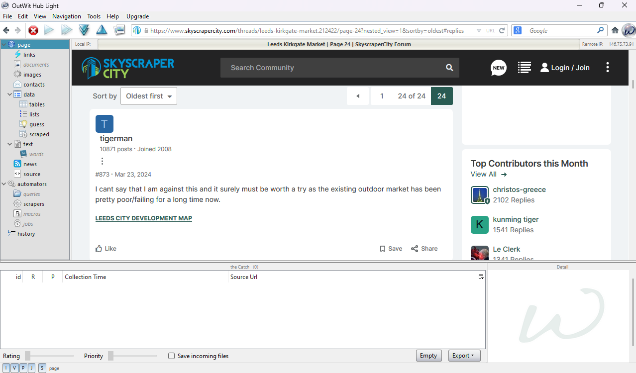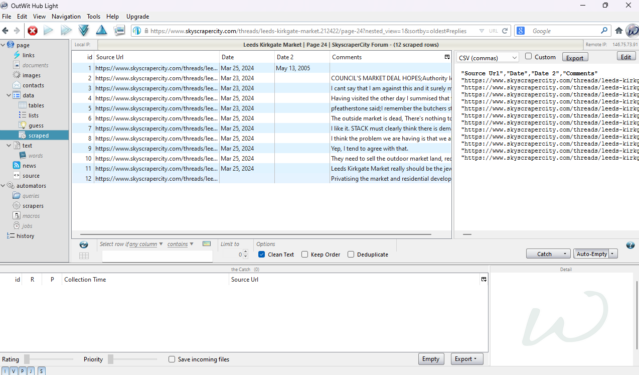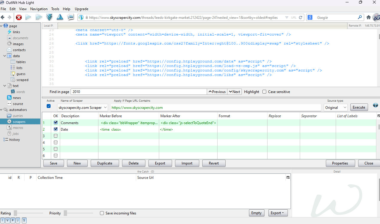 After opening the webpage in Outwit Hub, the next step in our data scraping process involved creating a scraper. We accomplished this by inputting specific tags or markers that would help us identify and extract the desired information, the comments and their corresponding dates.