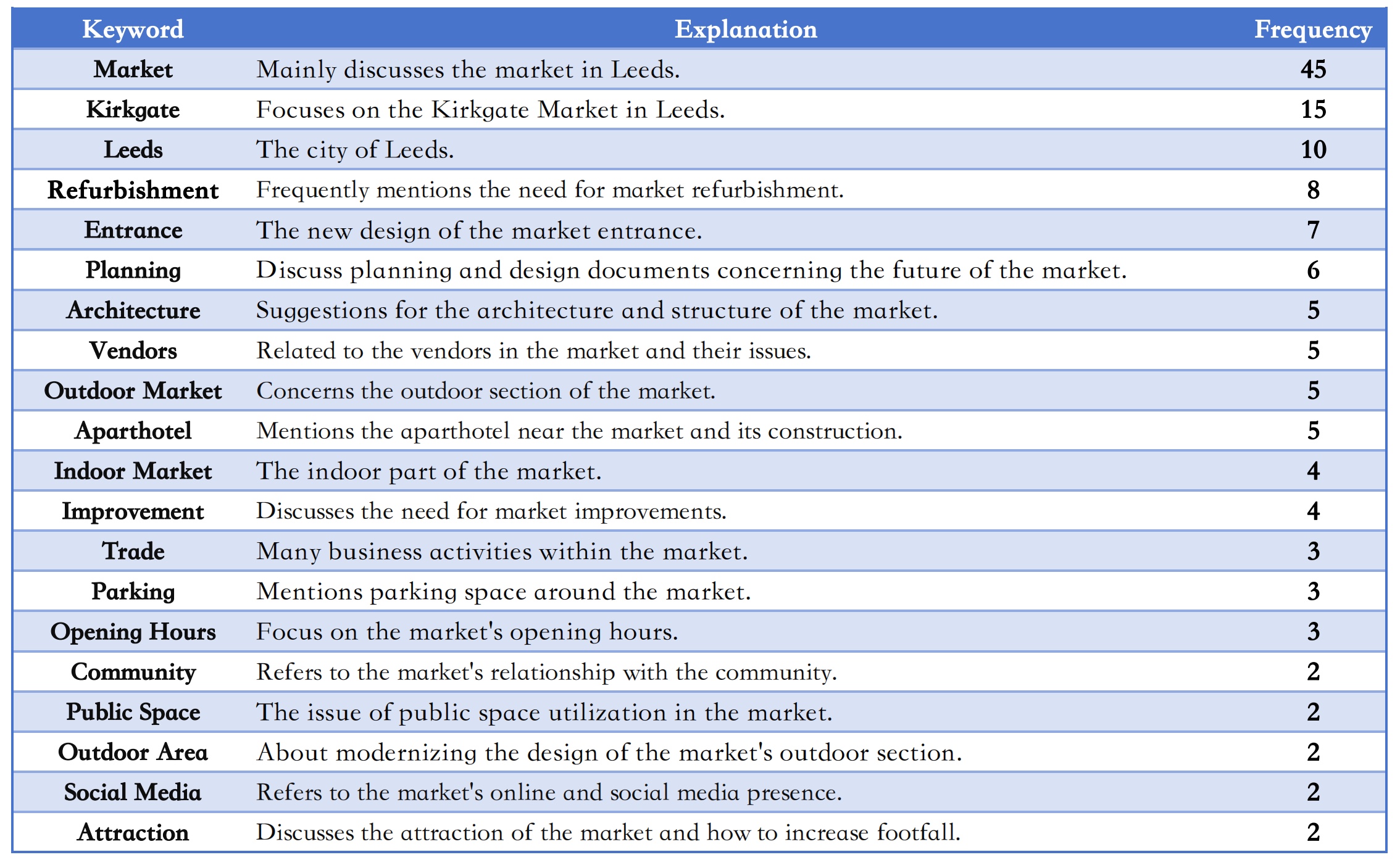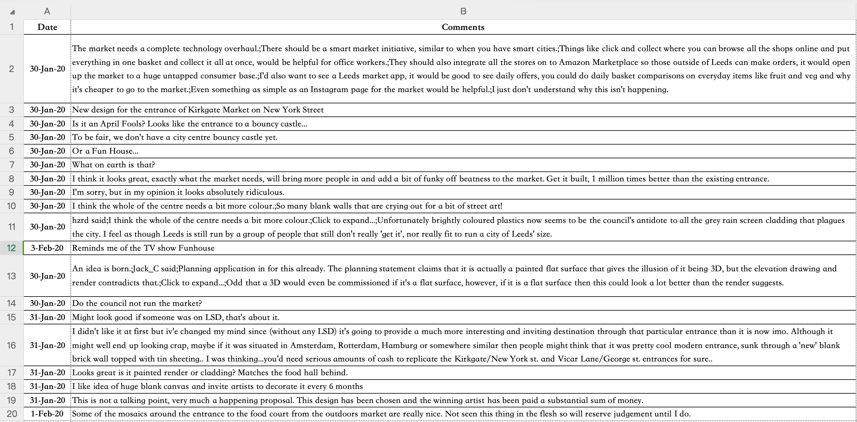 To identify people’s perspectives and ideas about new innovations and changes in Kirkgate Market, we went on to a forum titled “SKY SCRAPER CITY” and looked at a forum addressing the plans of major investment and makeover for the Kirkgate Market. This question was raised in 2005 with over 800 responses till now. However, to get more relevant comments we filtered our data and selected comments from 2020 till now.